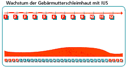 Bei Anwendung des IUS wird Ihre Monatsblutung nach und nach immer kürzer, schwächer und weniger schmerzhaft. Denn im Laufe der Anwendung baut sich die Gebärmutterschleimhaut nur noch schwach auf. Da dieser Anpassungsprozeß etwas Zeit braucht, treten in den ersten 3 - 6 Monaten der Anwendung häufig Zwischenblutungen und verlängerte Blutungen auf. Von Zyklus zu Zyklus werden die Blutungen insgesamt immer kürzer und schwächer. Nach einjähriger Anwendung tritt im Schnitt nur noch an einem Tag pro Monat eine schwache Blutung auf. Bei ca. jeder 4. - 5. Frau, die das IUS hat, kann die Blutung auch nach und nach ganz ausbleiben, was medizinisch völlig unbedenklich ist. Aufgrund dieser Veränderungen eignet sich das IUS auch zur Behandlung einer (zu) starken Menstruation.